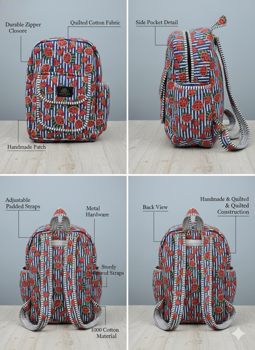Bright, playful, and beautifully crafted, the Watermelon Pop Backpack brings together fun design and dependable quality. Made with a soft quilted fabric and a bold watermelon print, it’s the perfect blend of style and comfort for little ones on the go. Sustainable, handmade block print cotton quilted bags which are light weight and easy to wash.