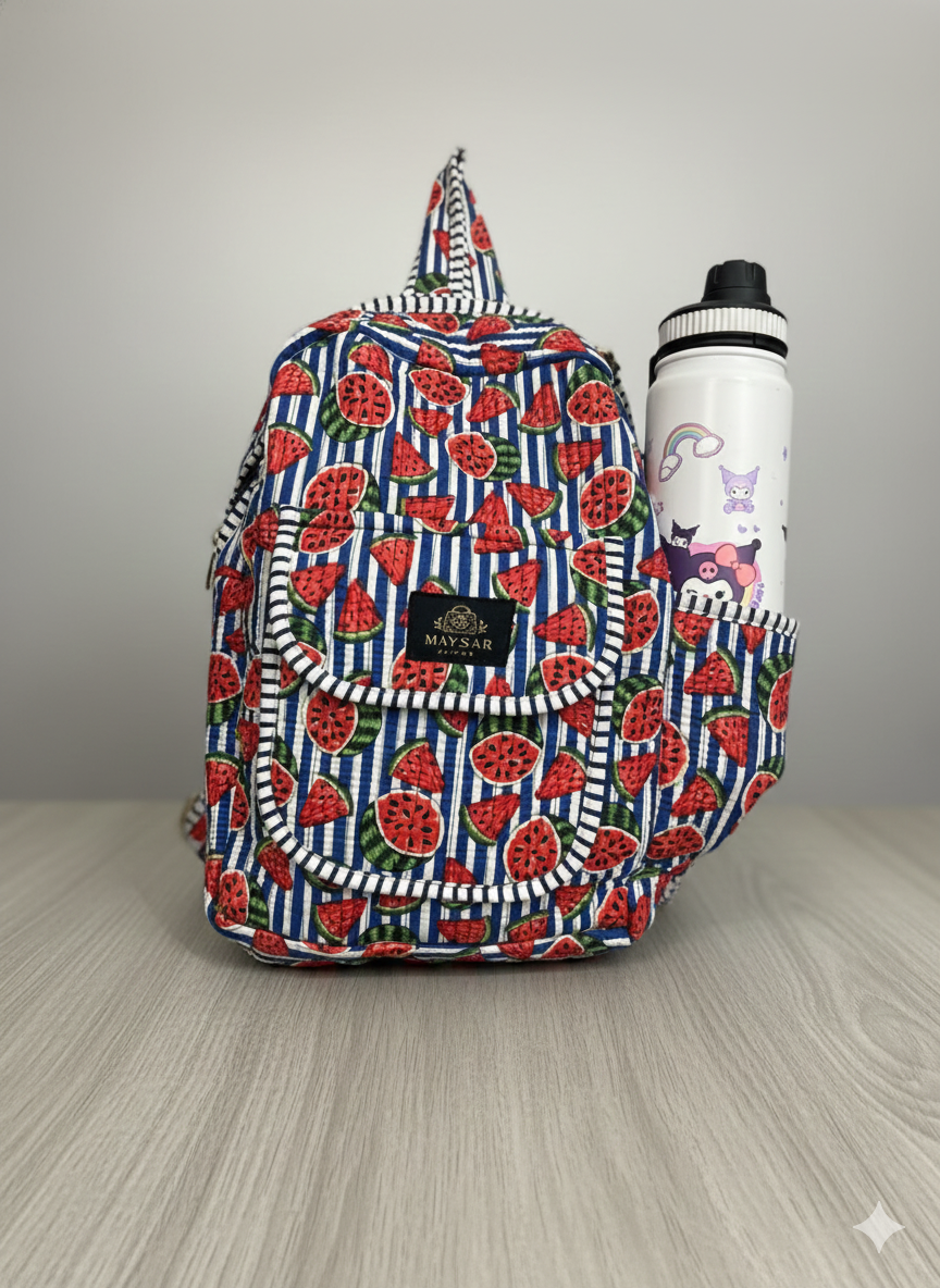 The eye-catching watermelon pattern paired with classic blue-and-white stripes makes this backpack instantly lovable. It adds a fun pop of color to any outfit while still looking neat and well-crafted.